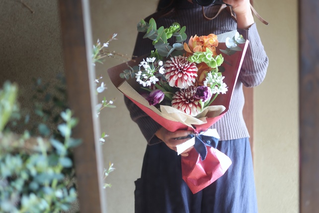 紅白のダリア、大輪のシンビジューム、ぐっと濃い紫色のチューリップなどを合わせて、束ねさせていただきました。