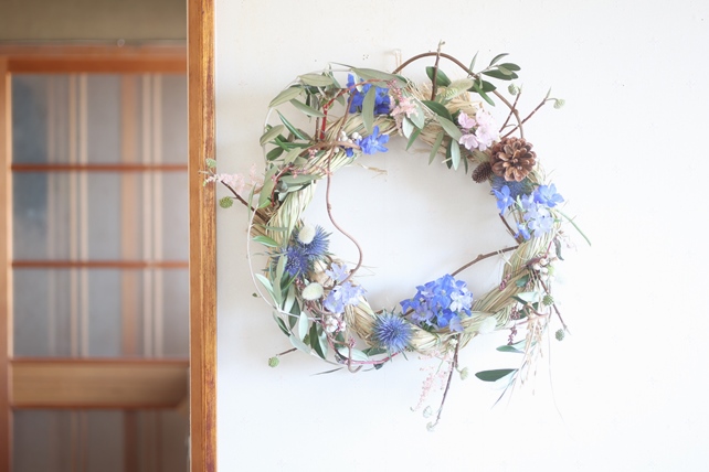 「ブルーのデルフィニウムと、お庭のオリーブを合わせて」、と、オーダーいただいたスワッグ。