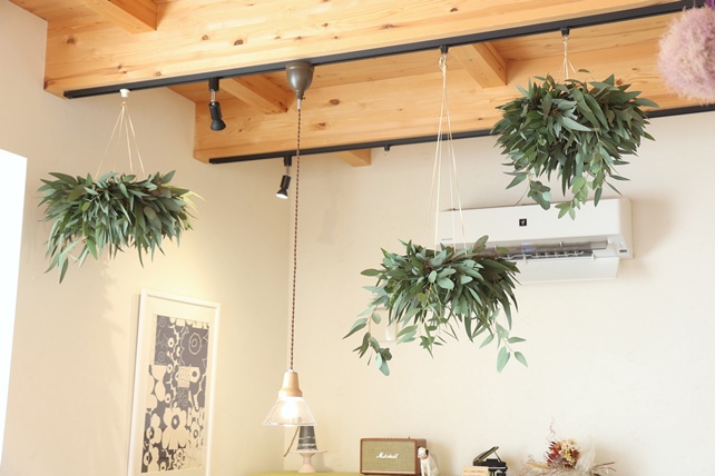 昨日は、高砂のterhoさんで、ユーカリメインに、ローズマリーを少し合わせた、フライングリースづくりワークショップでした。
