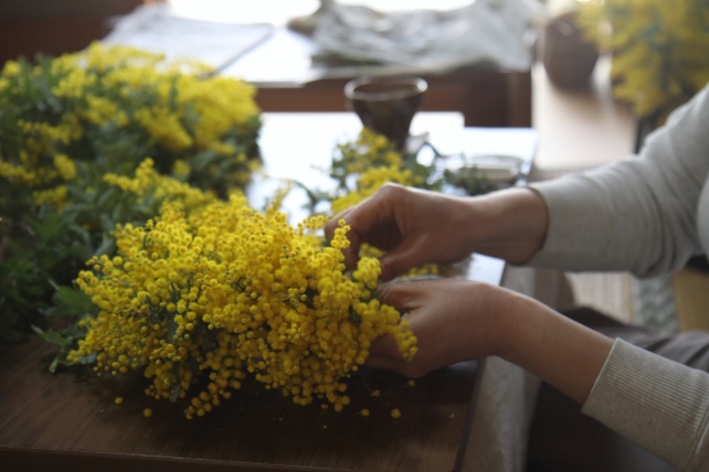 摘み取ったミモザは、le petit bonheur のアトリエに持ち帰り、たっぷりのミモザを束ねました。