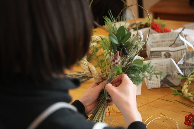 自分らしい形を作り、縁起のよい赤い実や松などを添えて、歳神さまを迎えるしめ飾りに仕上げます。