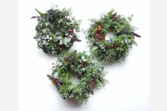 植物の名前:ヒムロ杉/コニファー(ボールバード)/コニファー(ブルーアイス)/ユーカリ(銀丸葉)/ヒエ(チョコラータ)/ビバーナムティナス/シルバーブロニア/野ばらの実/バラの実(センセーショナルファンタジー)
