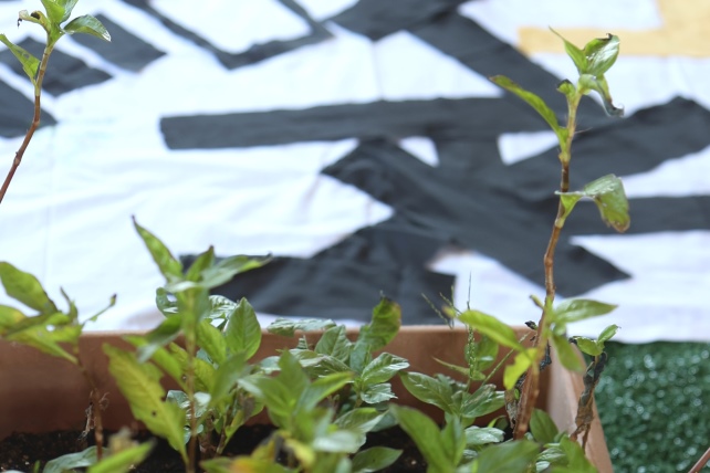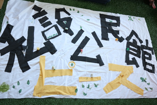 前日に、子供たちが、大きな白い布に、布をカットして、「私設公民館ピース」の文字を作ってくれていました。