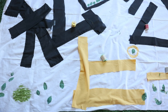この後、仮止めされている文字が、ちくちく糸で縫いとめられて、完成に向かいます。