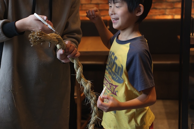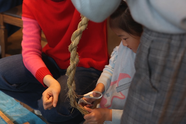 「室内で作業していただいて大丈夫」、とおっしゃっていただけたので、とても寒い日でしたが、ぽかぽかあたたかな室内で、藁を綯うところから、作りました。