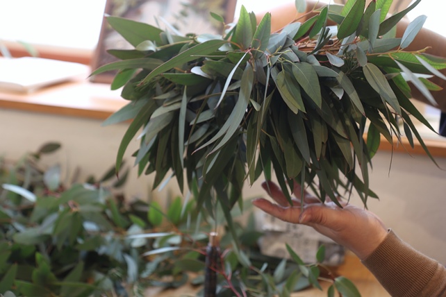 軽やかに流れ落ちる葉の動きをどう活かすか、ちょっと頭を使いながら束ねるリース。