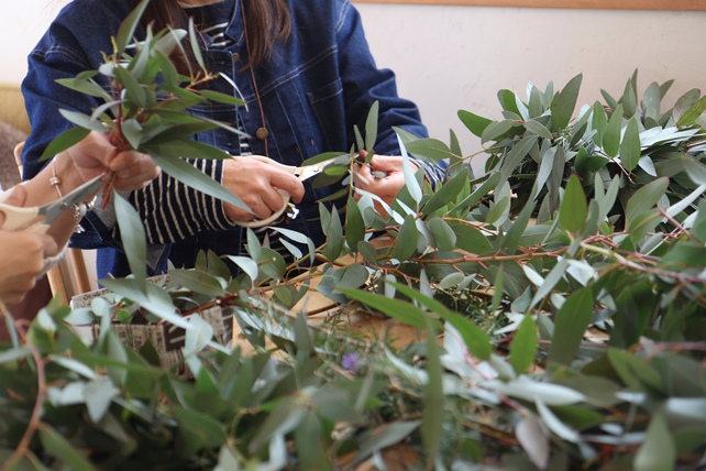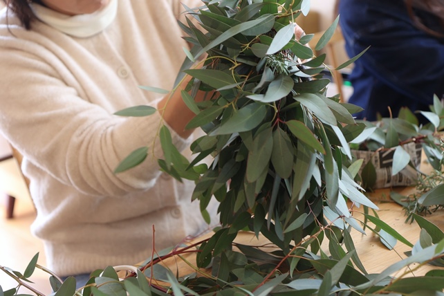 昨日は、高砂のterhoさんで、ユーカリメインに、ローズマリーを少し合わせた、フライングリースづくりワークショップでした。