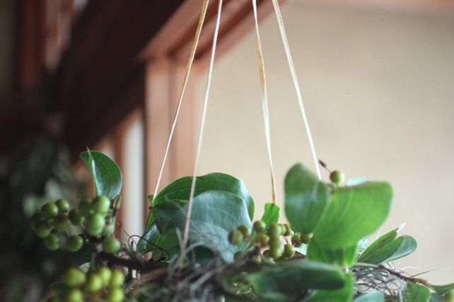 夏だけのお楽しみ、グリーンの実と葉が綺麗なサンキライをフライングリースに仕立てました。