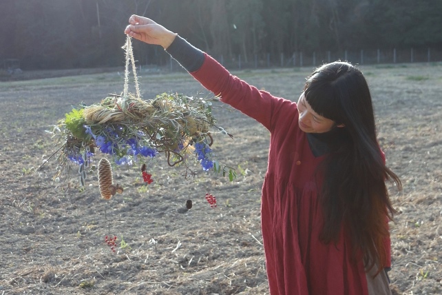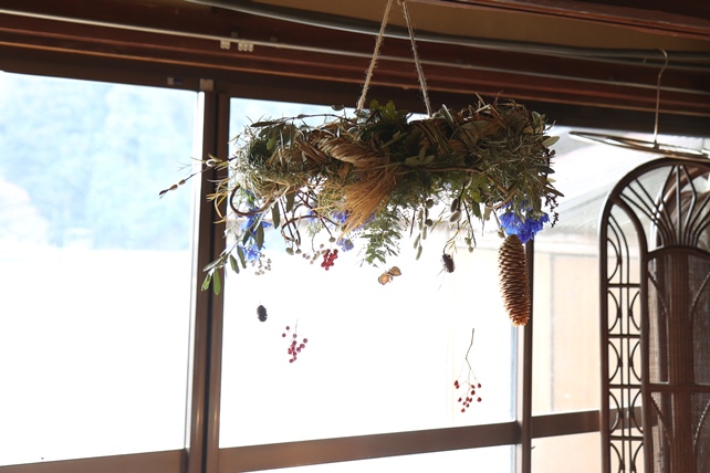植物の名前:稲藁/キウイの蔓/オリーブ/ティーツリー/ミモザ/ローズマリー/ネコヤナギ/ミツマタ/デルフィニウム(スーパーシフォンブルー)/松ぼっくり/南天の実/野ばらの実/ナンキンハゼ/綿殻/タデアイ他