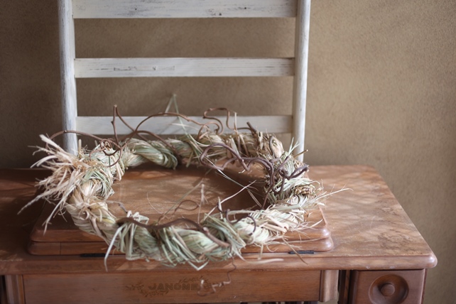 提案して、いいね!となって、いつもは、蔓の土台を使ってリースを束ねますが、今回は、藁の土台を、藁を綯うところから作りました。