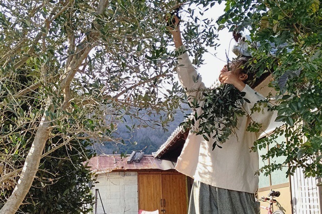 お庭の、オリーブ、ミモザ、ティーツリーなどを摘ませてもらって。