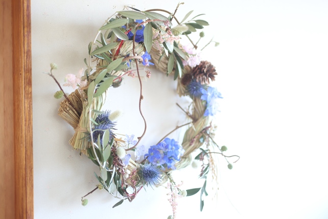 「好きな色は、蒼、碧、桃,藍。優しい色合いで、玄関に飾れるリースを。壁掛けタイプ