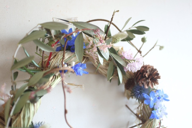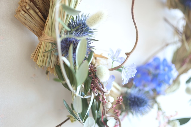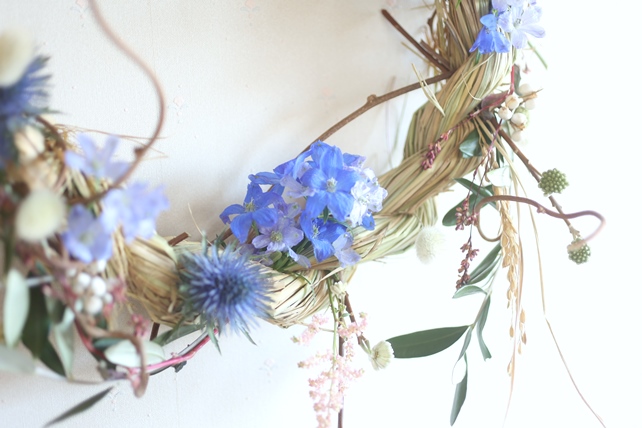 植物の名前:藁/キウイの蔓/オリーブ/ミツマタ/ナンキンハゼ/アスチルベ(ライトピンク)/エリンジューム(マグネーター)/ラグラス(バニーテール)/デルフィニウム(スーパーグランブルー/サクラヒメ)/タデアイ