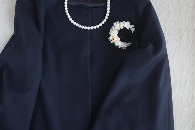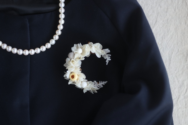 白い紫陽花の三日月コサージュ。