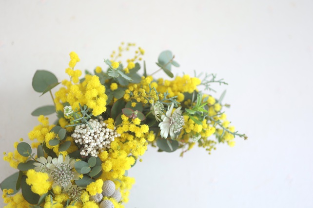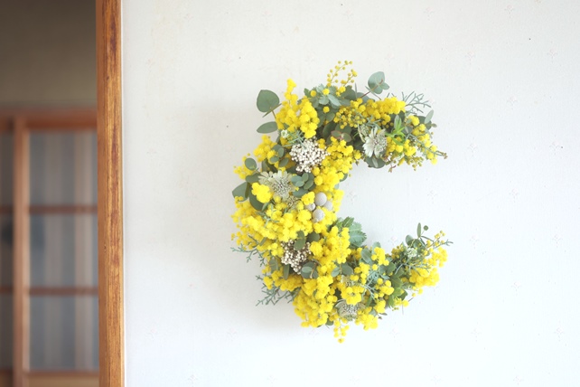 ふわふわの黄色い花・ミモザに、香りのよいユーカリや白い小花などを合わせた、三日月リース。