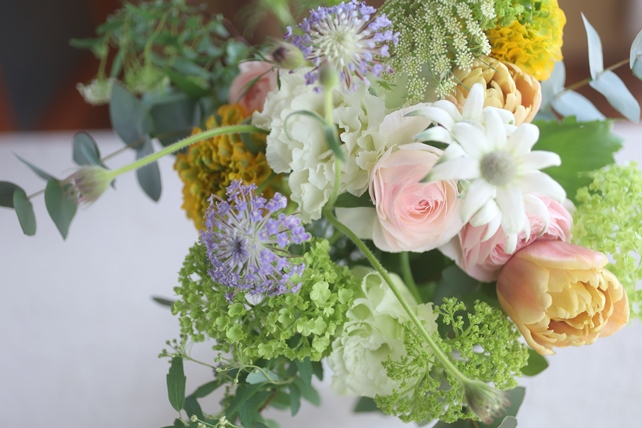 植物の名前:ラナンキュラス(ピンク/ポンポンルナ)/フランネルフラワー(ファンシーマリエ)/レースフラワー(ブルーレースフラワー・瀬戸のブルー/グリーンミスト)/チューリップ(ラ・ベルエポック)/コデマリ/ユーカリ(銀丸葉)
