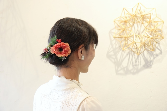 髪に、生花を添え花させていただきました。