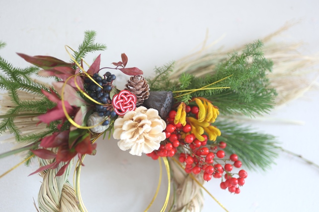 「太めのしめ縄で。赤と金多めで。」と、オーダーいただいたしめ飾り。