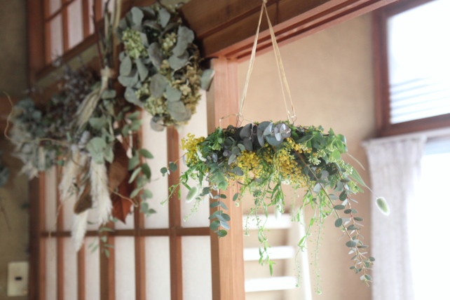 逆さにして、植物たちの流れ落ちる様子を確認しながらのリースづくりは、いつものリースづくりとは、ちょっと違った難しさもありつつ、みなさん、それぞれに、素敵な雰囲気に仕上げてらっしゃいました。