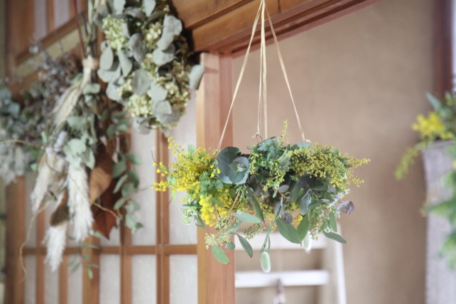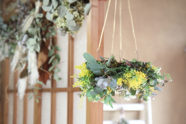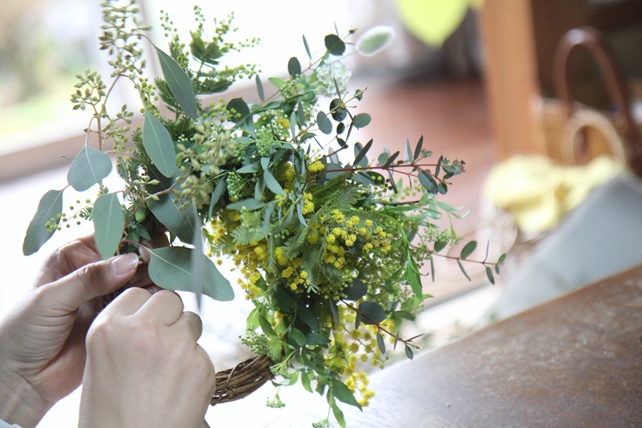 今年初めて仕入れたミモザを束ねて、フライングリースづくり。