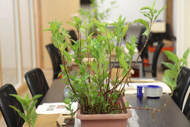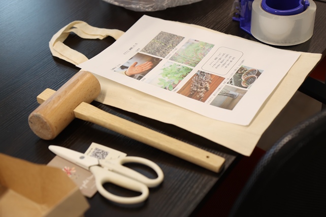 タデアイのプランターを3つ、持ち込んで、自由に摘み取りながら、デザインを考えて、たたき染めを。