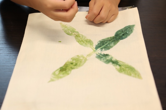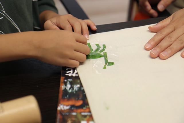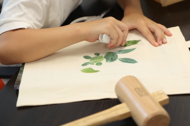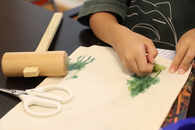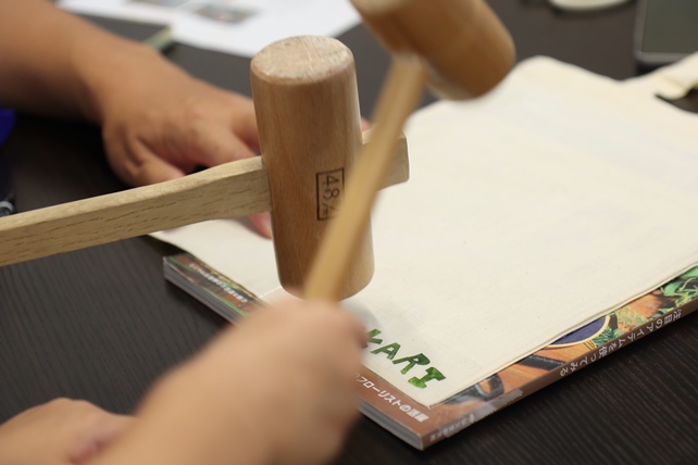 保護者同伴ワークショップで、親子で相談したり、協力しながら、どの子も、集中してたたき染めをしていました。
