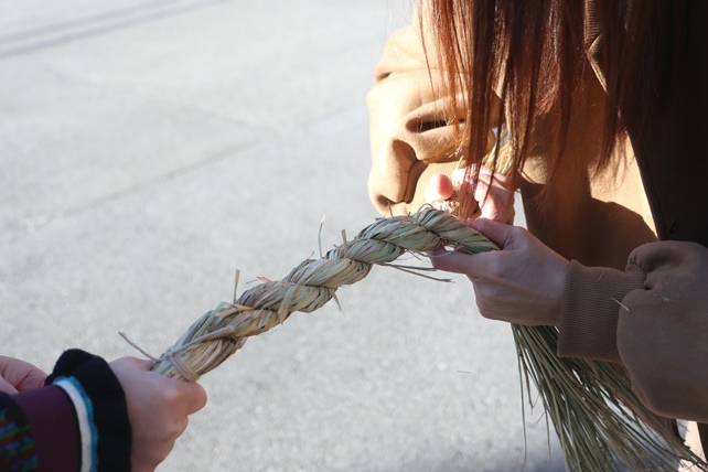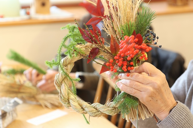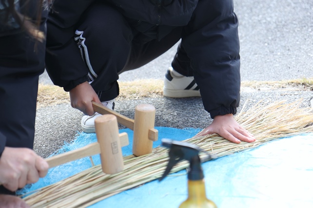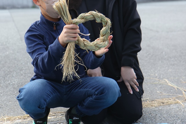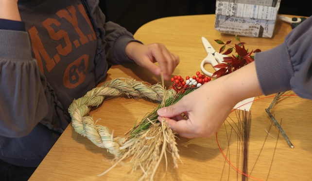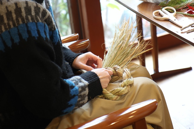 藁を綯って、しめ縄を作るところから始める、しめ飾りづくりワークショップ。