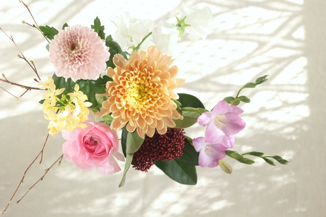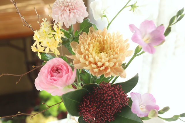 植物の名前:ピンポンマム(アリョンカサーモン/オペラピンク)/エピデン(ユキ)/フリージア(オリオン)/ラナンキュラス(レト)/スイトピー(クリスタル)/シキミア(レッド)/花水木