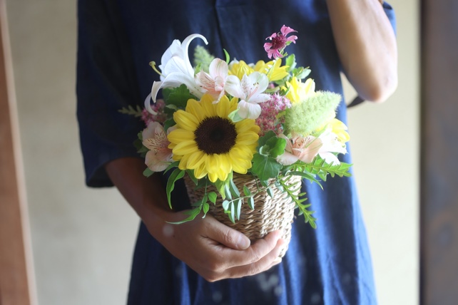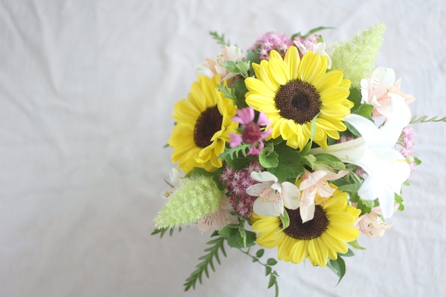 白いユリに、黄色の向日葵、ピンクの花たちを合わせて。