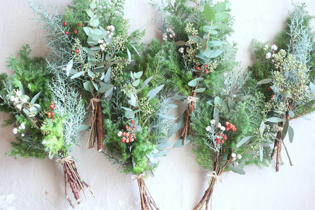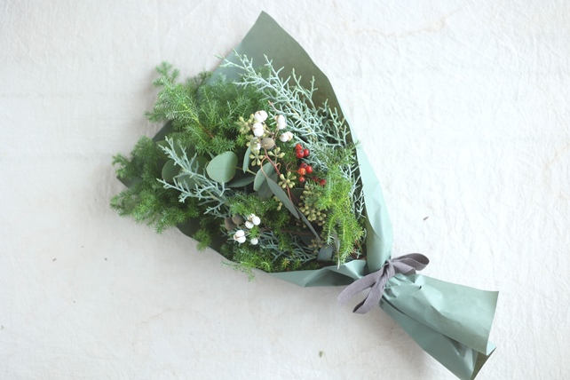 今の季節らしい針葉樹ベースに実ものを少し合わせ、水に活けて飾っても、そのままドライフラワーにしても楽しめそうな、そんな植物を束ねさせていただきました。