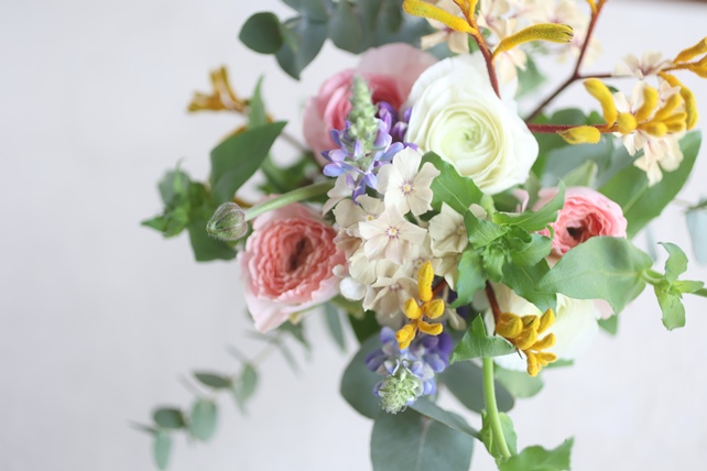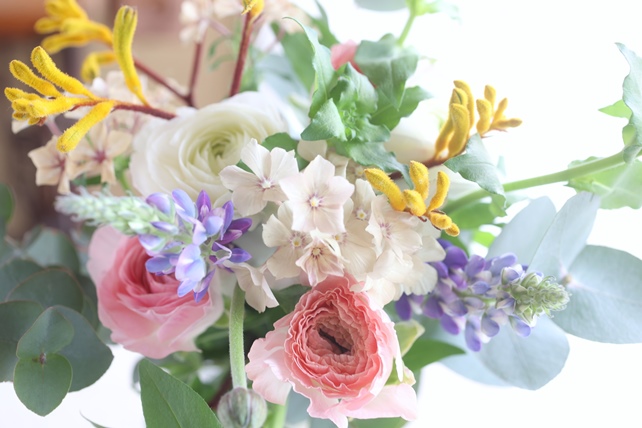 植物の名前:ラナンキュラス(プラージュ/雪ん子)/ルピナス(ピクシーデライト)/フロックス(クリームブリュレ)/カンガルーポー(イエロージエム)/ユーカリ(銀丸葉)