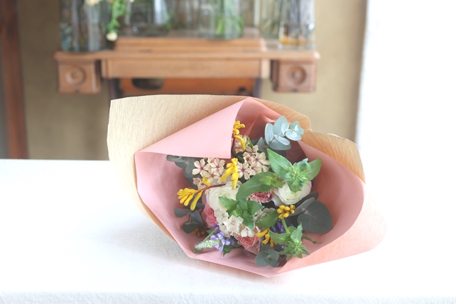 淡い色合いのミックスカラーで束ねました。