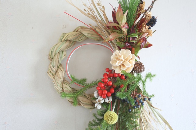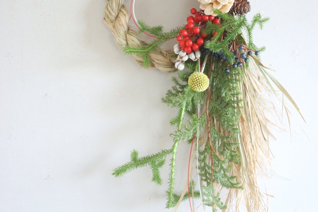 横飾りでのお届けを毎年させていただいたのですが、今年は、和洋折衷の縦飾りを。