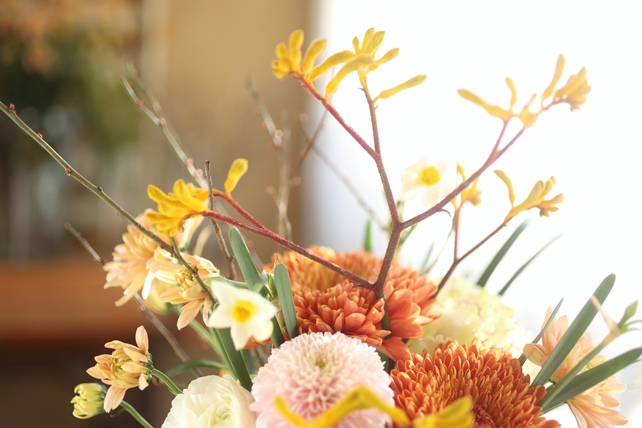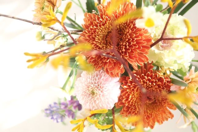 植物の名前:ピンポン菊(オペラピンク/バヴェーノオレンジ)/スプレー菊(バルティカサーモン)/水仙/葉ボタン(ラッフルバニラ)/ラナンキュラス(雪ん子)/フロックス(クリームブリュレ)/ルピナス(ピクシーデライト)/カンガルーポー(イエロージエム)/梅/ミスカンサス