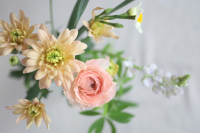 植物の名前:スプレー菊(バルティカサーモン)/ラナンキュラス(プラージュ)/水仙/ルピナス(ピクシーデライト)