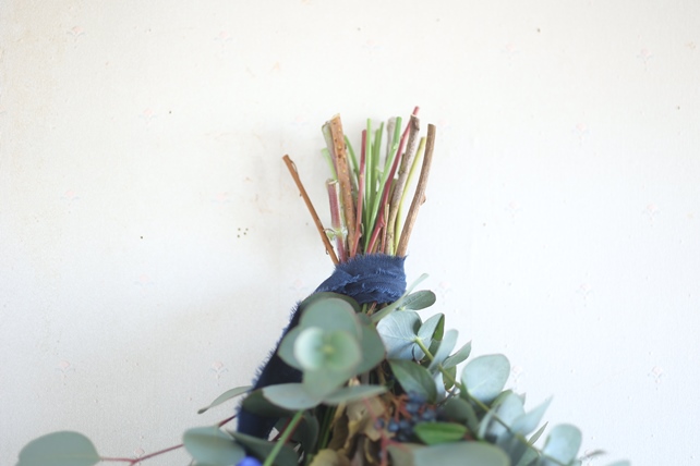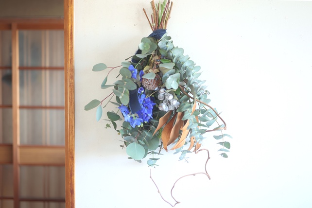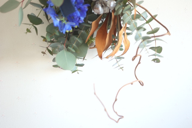 植物の名前:ユーカリ(銀世界/ポポラス)/グレビリアゴールド/ユーカリの実(テトラゴナッツ)/デルフィニウム(スーパーグランブルー)/ビバーナムティナス/リューガデンドロン(ジェイドパール)/バンクシア(コクシニア)/キウイの蔓