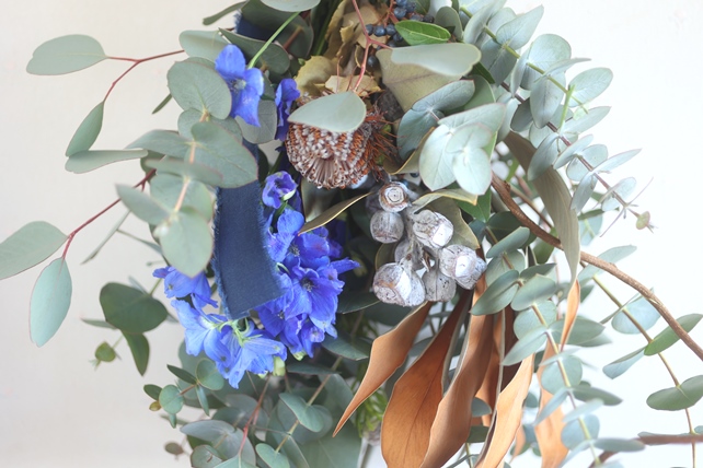 深い色合いのブルーのデルフィニウム、かっこいいバンクシアやユーカリの実、葉の色が大人っぽいグレビリアゴールドなどを合わせました。