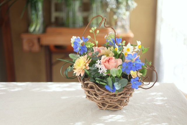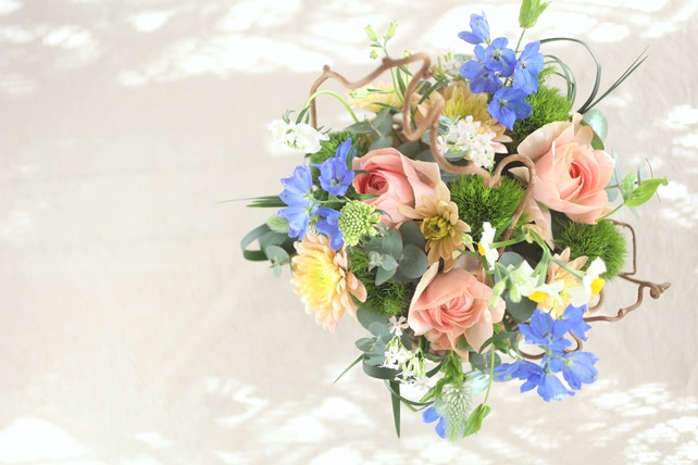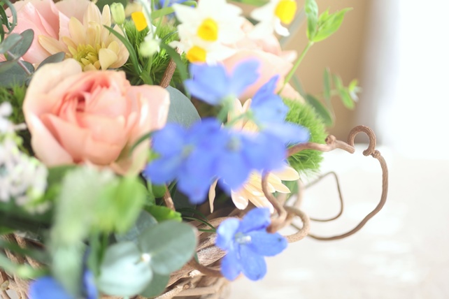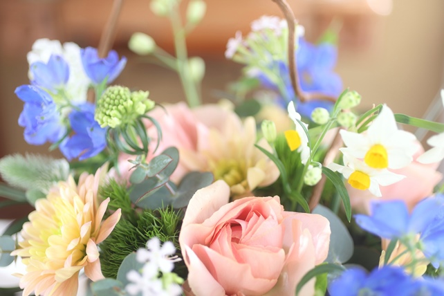植物の名前:ラナンキュラス(笑美)/スカビオサ(ミルキースコープ)/サクラコマチ(シレネ)/ナデシコ(レディイングリーン)/トリフォニウム(ホワイト)/水仙/デルフィニウム(スーパーグランブルー)/スプレー菊(バルティカサーモン)/ミスカンサス/ユーカリ(ポポラス/銀世界)