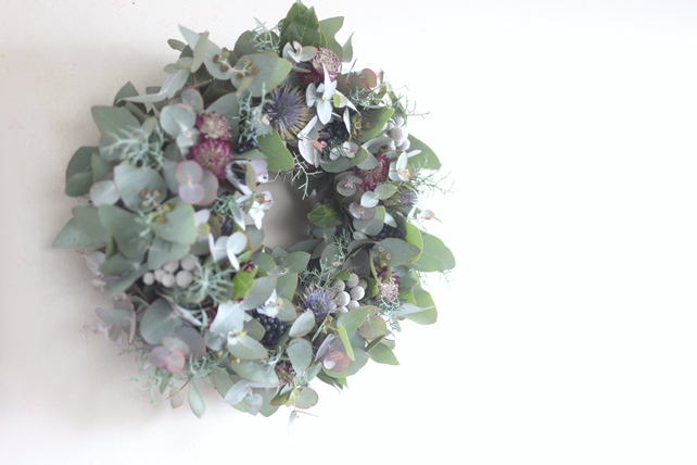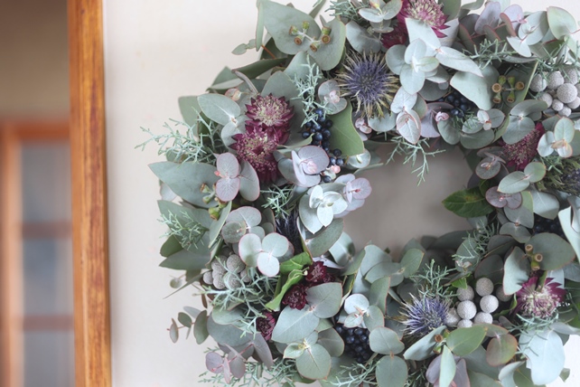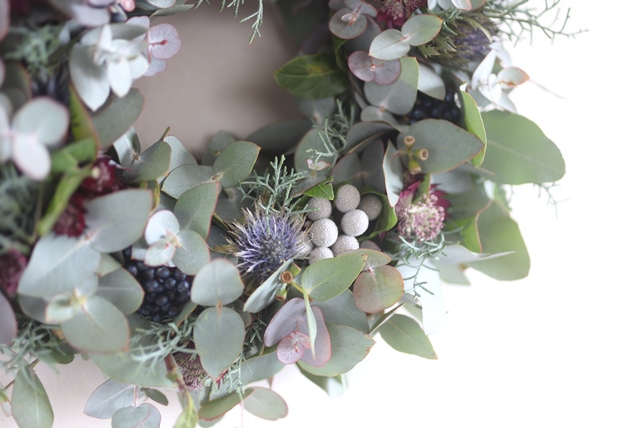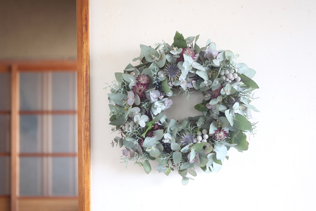 「お引越しされた、新居の玄関ドアに飾りたい」、というご希望で、オーダーいただいたユーカリリース。