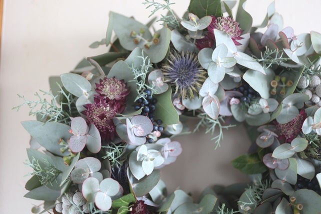 植物の名前:ユーカリ(銀丸葉)/ブルーアイス/ビバーナムティナス/シルバーブロニア/アストランティア(スターオブファイヤー)/エリンジューム(マグネーター)