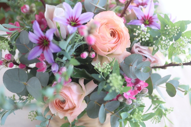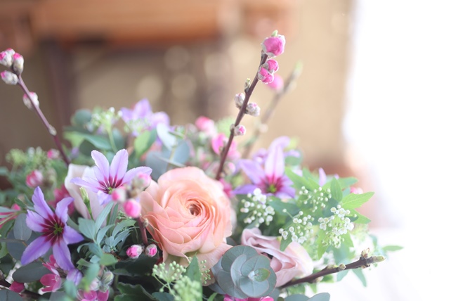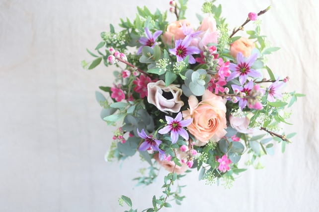 植物の名前:矢口桃/アネモネ(ホワイトセンターブラック)/ラナンキュラス(エムベージュ)/オキシペタラム(ピンクスター)/コデマリ/リューココリネ/ユーカリ(銀丸葉)